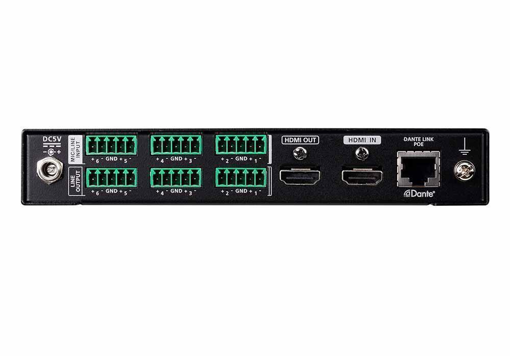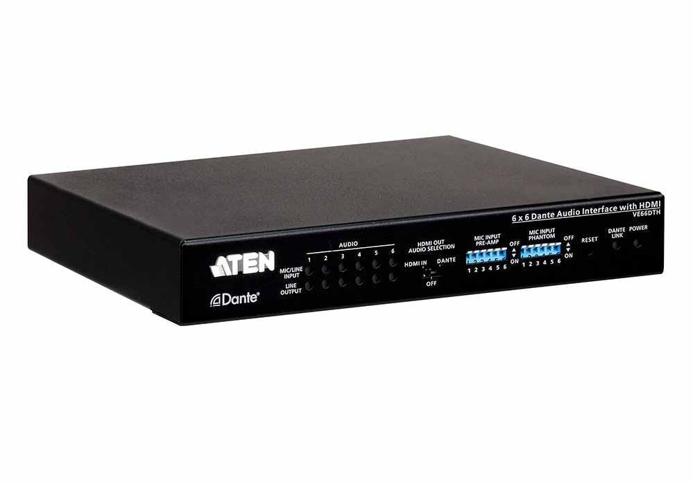 Устройство VE66DTH компании ATEN, это звуковой интерфейс с шестью входами и шестью выходами, использующий транспортную систему Dante (Digital Audio Network Through Ethernet) и оборудованный HDMI. Применение Dante™, как наиболее популярного решения для создания аудиосетей, разработанного компанией Audinate, позволяет устройству VE66DTH передавать через стандартную IP-сеть несжатые цифровые аудиосигналы с практически нулевой задержкой. Устройство VE66DTH через сеть Dante передает и принимает до 6 каналов входа и выхода звука. Входа звука могут одновременно поддерживать различные подключения – как линейный вход, так и динамический, а также конденсаторный микрофоны. Вместе с этим устройство может обеспечить 48В фантомного питания для конденсаторных микрофонов. Благодаря встроенной функции PoE (питание через Ethernet) VE66DTH может быть запитано по Ethernet-кабелю от совместимого PSE-устройства (power sourcing equipment, оборудование-источник питания). Кроме того, устройство VE66DTH предоставляет гибкие возможности по извлечению и встраиванию звука. Оно может извлечь стерео аудиосигналы из HDMI-потока в сетевую систему Dante и встраивать аудиосигналы из Dante-облака в HDMI-вывод.