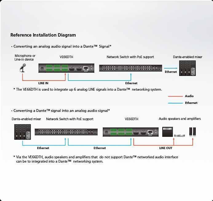 Устройство VE66DTH предназначено для широкого спектра сред, таких как конференц-центры, концертные залы, развлекательные заведения или для других вариантов использования, в которых требуется внедрение профессиональных аудиоустройств на базе Dante для расширенного и гибкого применения аудио/видео, передаваемого по сети. Улучшенная производительность системы, сокращение количества кабелей и многое другое позволят пользователям VE66DTH извлечь выгоду при использовании его в группах оборудования любого размера.