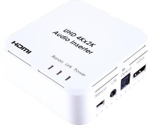Эмбеддер стереофонического аудиосигнала (miniJack 3,5 мм) и цифрового 5.1-канального S/PDIF (TOSLINK) в HDMI 1080p (4Kх2K, 3D) c HDCP, EDID и CEC.