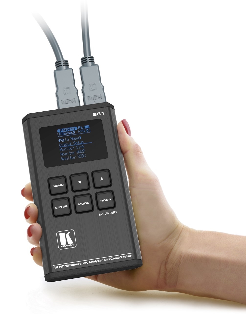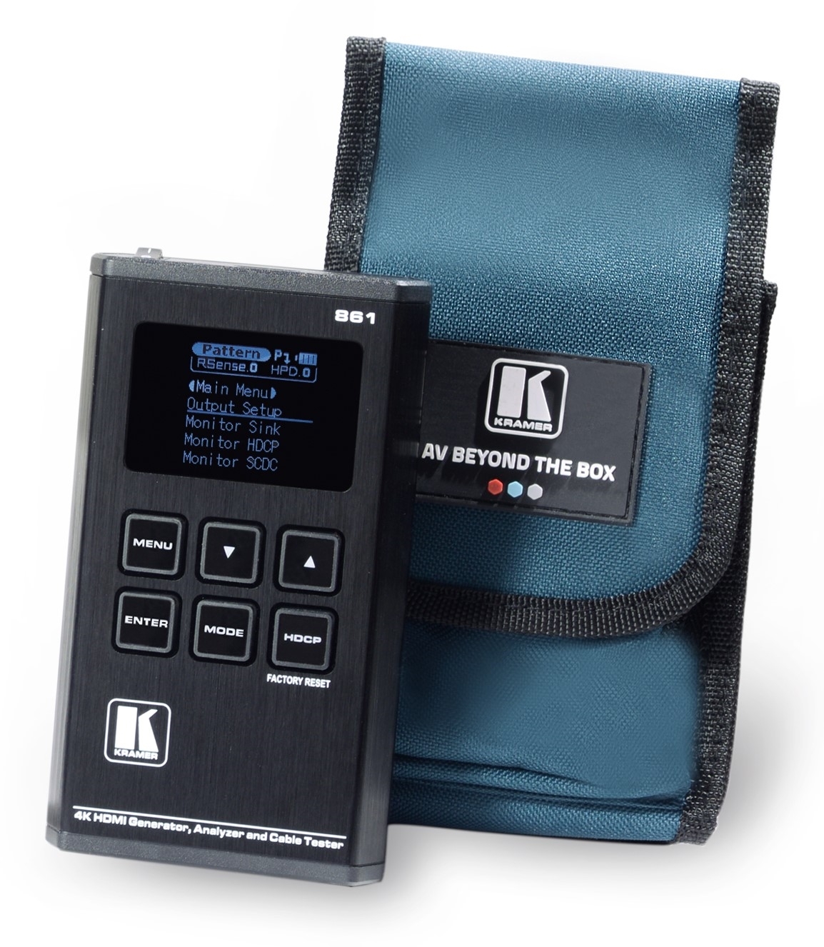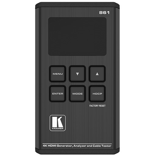 Генератор анализатор сигнала Kramer 861 – портативный генератор / анализатор сигналов HDMI с разрешением до 4096x2160/60 (4:4:4, 8 бит); поддержка HDCP 1.4/2.2 и HDR; тестер кабелей; расширенная поддержка EDID с 10-ю стандартными и 10-ю пользовательскими наборами данных, мониторинг служебного канала SCDC.