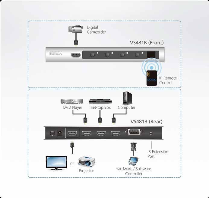 VS481B-AT-G – Видео Коммутатор ATEN VS481B позволяет Вам быстро подсоединить 4 источника HDMI сигнала к одному дисплею с интерфейсом HDMI и легко переключаться между ними с помощью кнопок на передней панели, последовательного порта RS-232 или ИК пульта дистанционного управления. Светодиоды на передней панели указывают исходное устройство, выбранное для отображения .Коммутатор VS481B поддерживает разрешение Ultra HD 4Kx2K, являющееся новейшим для дисплеев с высоким разрешением, режим Auto Switching для автоматического выбора порта, мгновенное переключение с повышенной эффективностью для плавного видео перехода между HDMI портами и имеет встроенный двунаправленный последовательный порт RS-232, что позволяет коммутатору быть управляемым с помощью высококлассного контроллера, компьютером и / или с помощью программного пакета.