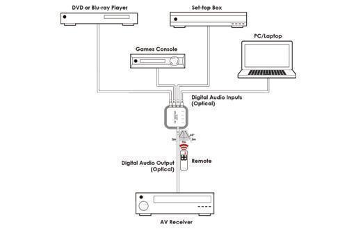 Коммутатор 4х1 сигналов цифрового двухканального аудио S/PDIF (TOSLINK) с частотой дискретизации до 192 кГц.