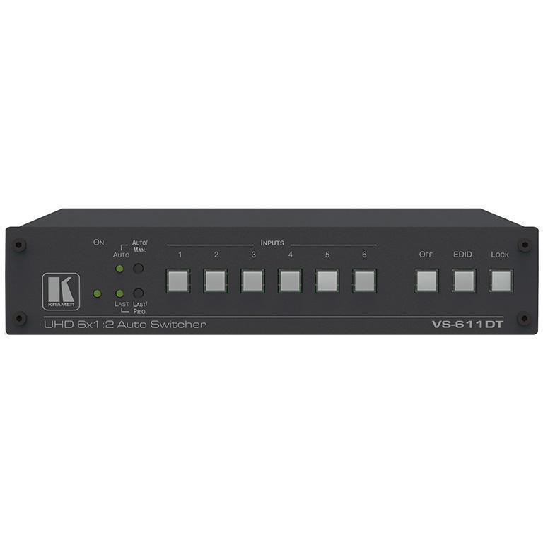VS-611DT – коммутатор 6х1 сигналов HDMI с разрешением до 4K/60 (4:2:0) c поддержкой HDCP 1.4, EDID и возвратного канала ARC с автоматическим переключением по наличию сигнала и дополнительным выходом HDBaseT с PoH. Устройство деэмбеддирует стереоаудио на балансный аудиовыход. Управление устройством осуществляется переключателями, «сухими» контактами, по IP и RS-232 (локально и через HDBaseT).