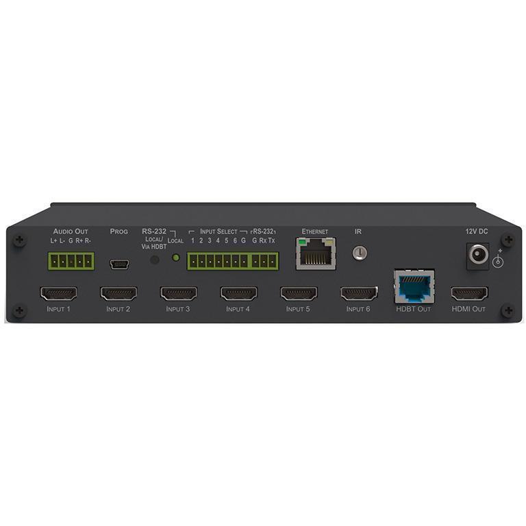 Коммутатор 6х1 HDMI 4K/60 (4:2:0) c HDCP 1.4, EDID с автоматическим переключением и дополнительным выходом HDBaseT; коммутация по наличию сигнала, PoH, балансный аудиовыход. Управление «сухими» контактами, по IP и RS-232 (локально и через HDBaseT).
