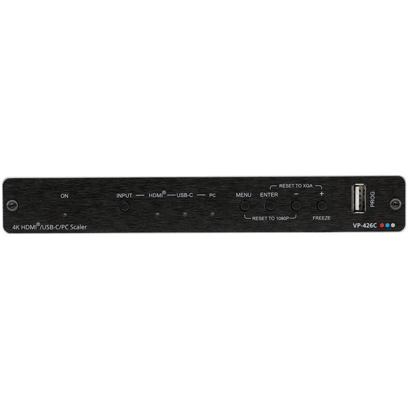 Kramer VP-426C – масштабатор и автоматический коммутатор сигналов VGA / YPbPr, USB-C и HDMI в выходной сигнал HDMI. Производит как повышающее, так и понижающее масштабирование сигналов разрешением до 4K/60 с поддержкой HDCP 2.2/1.4 и EDID. Масштабатор обеспечивает эмбеддирование аудиосигналов на входах и деэмбеддирование на выходе.