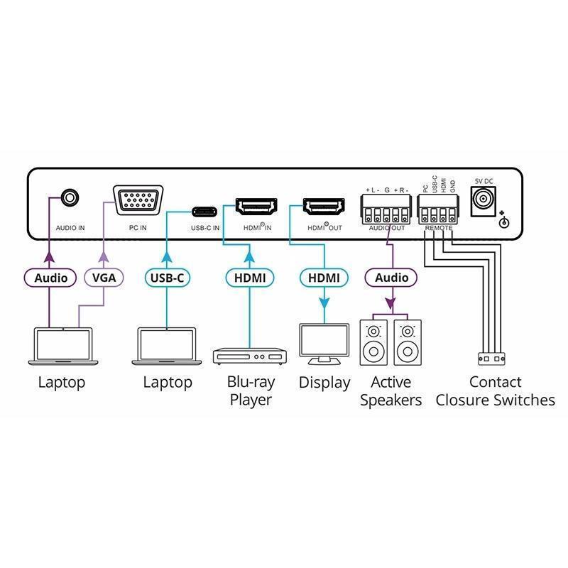 Масштабатор / автоматический коммутатор сигналов VGA / YPbPr, HDMI или USB-C в HDMI с эмбеддированием и деэмбеддированием стереоаудио, поддержка 4K/60 (4:4:4) с HDCP 2.2/1.4 и EDID. Управление «сухими» контактами.