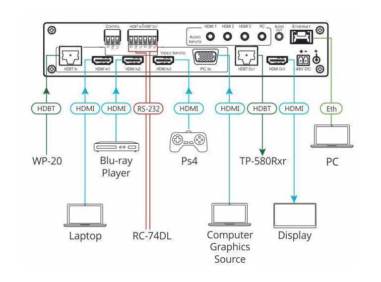 - Сигналы Ethernet и RS-232 передаются по HDBaseT