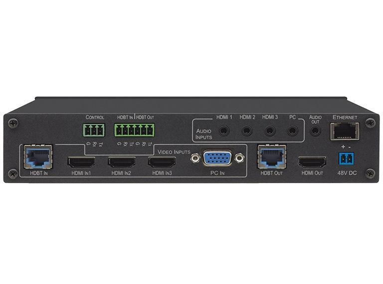 Масштабатор/автокоммутатор 3xHDMI, HDBaseT, VGA (1920x1200/60), 4 стереоаудио (miniJack 3,5 мм) в HDBaseT с двусторонним RS-232 и PoE / HDMI и стереоаудио; поддержка 4К60 4:4:4 и HDCP 2.2. Управление по ИК, RS-232 и через web-интерфейс.