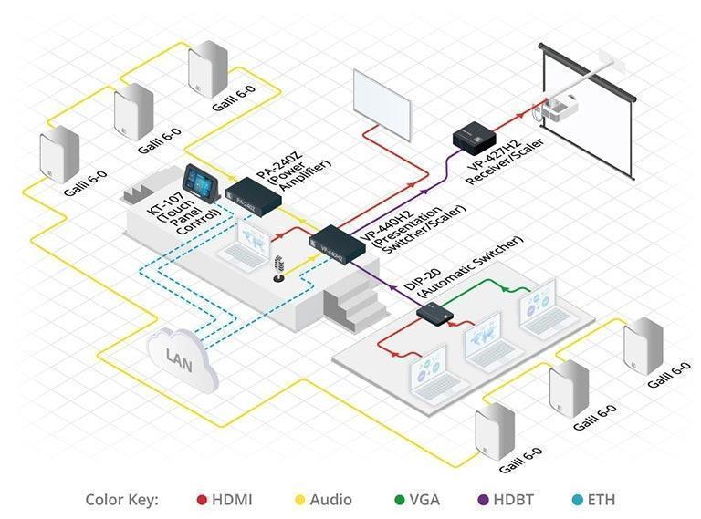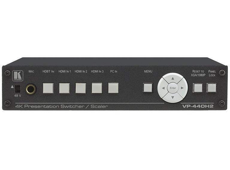VP-440H2 – презентационный масштабатор и автоматический коммутатор с тремя входами HDMI, входом сигнала из витой пары HDBaseT и входом компьютерного графического сигнала (VGA). Результирующий сигнал выводится одновременно на выходы HDMI и витой пары HDBaseT, которая обеспечивает двустороннюю передачу сигналов RS-232 и передачу питания PoE. Прибор дополнительно оборудован четырьмя входами и одним выходом небалансного стереоаудио на разъемах miniJack 3,5 мм. Для микрофонного входа (разъем Jack 6,3 мм) предусмотрена возможность включения фантомного питания 48 В. Управление по ИК, RS-232 и через web-интерфейс.