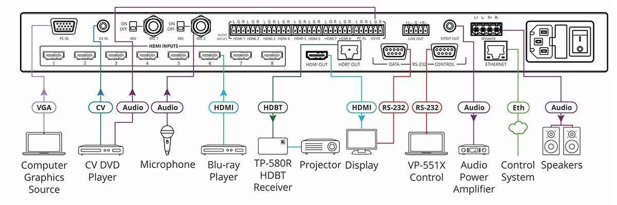 Kramer VP-551X – коммутатор, масштабатор сигналов 8хHDMI с HDCP 2.2, VGA, CV в сигналы HDMI и HDBaseT, с поддерживаемыми разрешениями видео до 4K/60 (4:4:4) на входах и выходах. Каждый вход сопряжен со входом аудио, также имеются два дополнительных микрофонных входа с фантомным питанием.