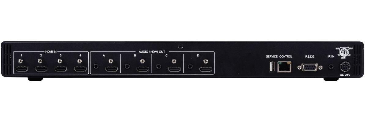Cypress CPLUS-V4H4HPA - матричный коммутатор 4х4 сигналов интерфейса HDMI 2.0 с поддерживаемым разрешением до 4096x2160/60, функцией 3D (цветовое пространство 4:4:4) и поддержкой технологий HDR, HDCP 1.4, 2.2. Коммутатор имеет соответствующие разъемы стереоаудио (4х miniJack 3,5 мм) и четыре разъема USB для питания активных оптических аудиокабелей, поддерживает эмбеддированное аудио в форматах LPCM 7.1, Bitstream и HD Bitstream. Управление прибором осуществляется по ИК, RS-232 и IP (Telnet и web-интерфейс).