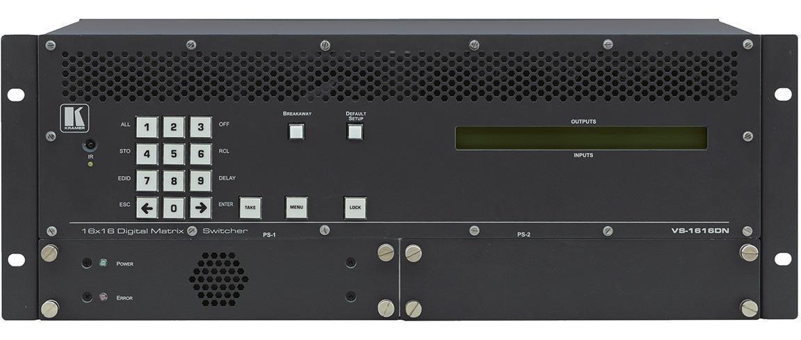 VS-1616DN-EM/STANDALONE – шасси мультиформатного матричного коммутатора с шестнадцатью слотами для установки интерфейсных модулей, позволяющее построить матричный коммутатор размерностью от 2x2 до 16x16 с шагом 2 входа/выхода. Поставляется с источником питания (с возможностью резервирования), встроенными модулями управления и тестирования. Доступно большое количество сменных модулей с интерфейсами VGA, DVI, HDMI, SD/HD/3G SDI, DGKat, HDBaseT. Улучшенная система принудительного охлаждения (два заменяемых вентилятора).|