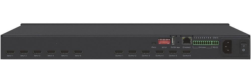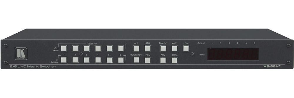 VS-66H2 – матричный коммутатор 6x6 сигналов HDMI с HDCP 2.2, EDID, 3D и ARC и Step-In. Поддерживает разрешения до 4K/60 (4:4:4). Позволяет подключить любой из входов к любому выходу или к любому набору выходов. Аудиоматрица устройства имеет размерность 12x12 (6 эмбеддированных аудио + 6 ARC + 6 цифровых выходов + 6 ARC) и коммутирует независимо от видео. Автоматическая коммутация, управление приоритетом, 16 пресетов. Устройство выполняет компенсацию АЧХ кабеля и перетактирование сигнала, восстанавливая его при передаче по длинным линиям с помощью технологии Kramer Equalization & re-Klocking™. Управляется по IP (web-интерфейс) и RS-232.