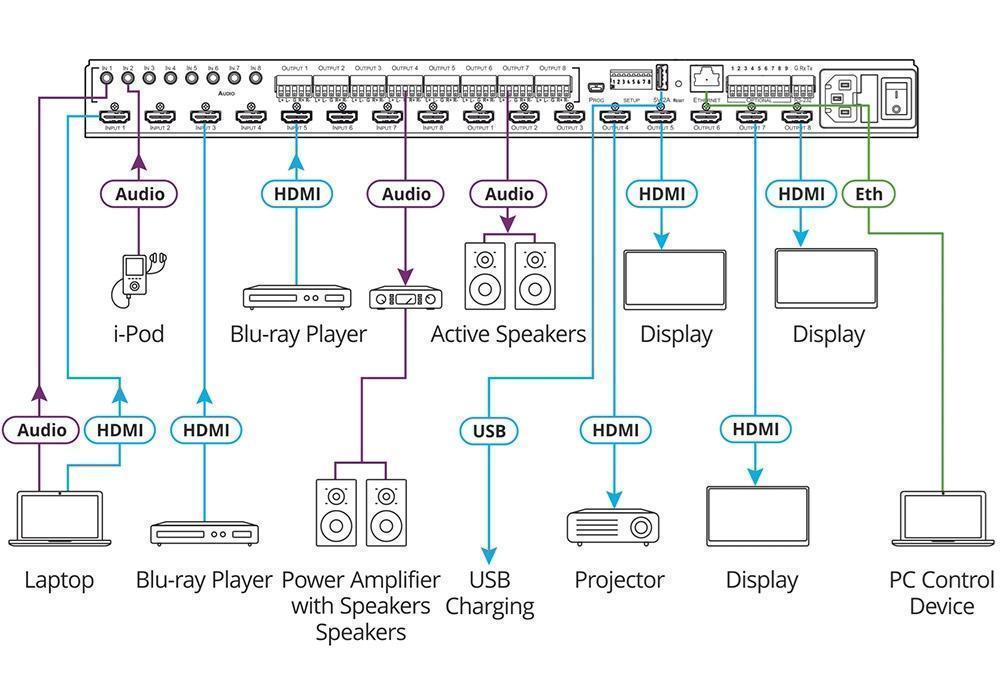 - Аудиоматрица 24×20: 8 вложенных аудиосигналов по HDMI + 8 аналоговых входов + 8 входных каналов ARC (Audio Return Channel) на 8 вложенных аудиосигналов по HDMI + 8 аналоговых выходов + 4 выходных канала ARC