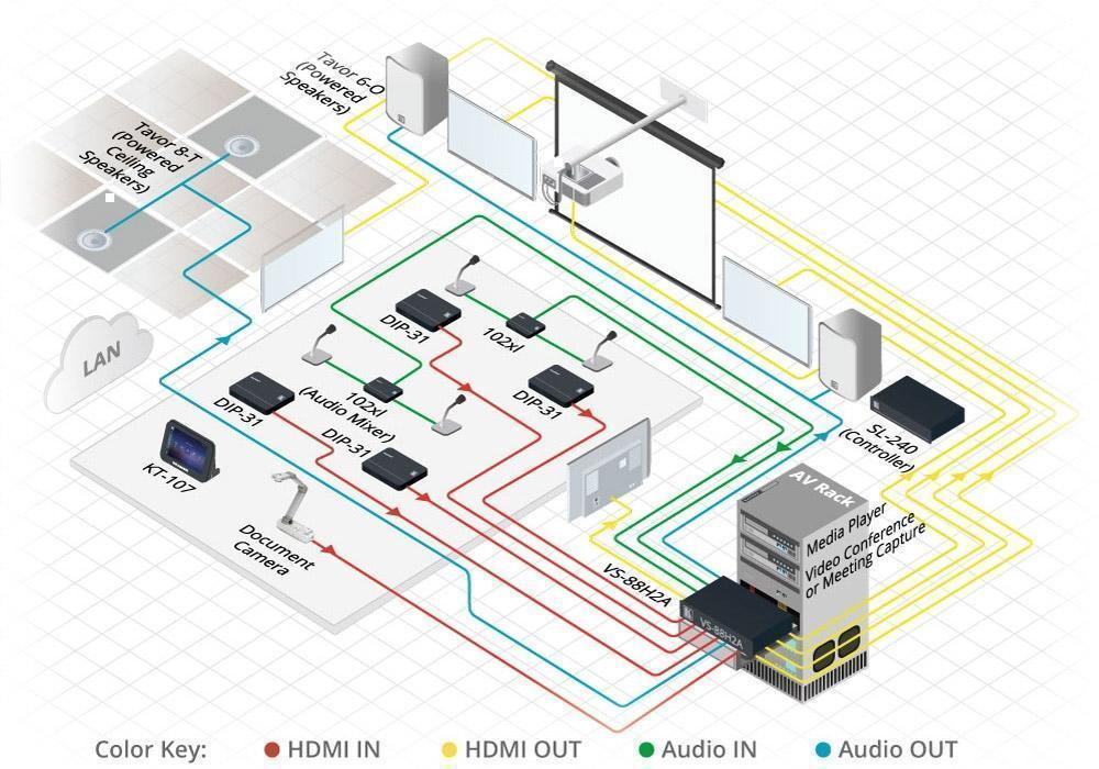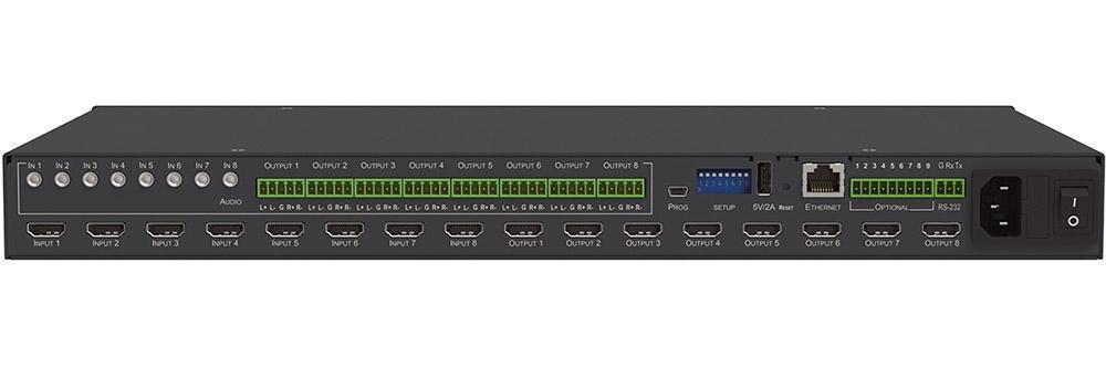 VS-88H2A – матричный коммутатор 8x8 сигналов HDMI с HDCP 2.2, EDID, 3D и ARC и Step-In, поддержка разрешения до 4K/60 (4:4:4). Позволяет подключить любой из входов к любому выходу или к любому набору выходов. Аудиоматрица устройства имеет размерность 24x20 (8 эмбеддированных аудио + 8 ARC + 8 аналоговых входов, 8 цифровых выходов + 4 ARC + 8 аналоговых выходов). Устройство выполняет компенсацию АЧХ кабеля и перетактирование сигнала, восстанавливая его при передаче по длинным линиям с помощью технологии Kramer Equalization & re-Klocking™. Управляется по IP (web-интерфейс) и RS-232.