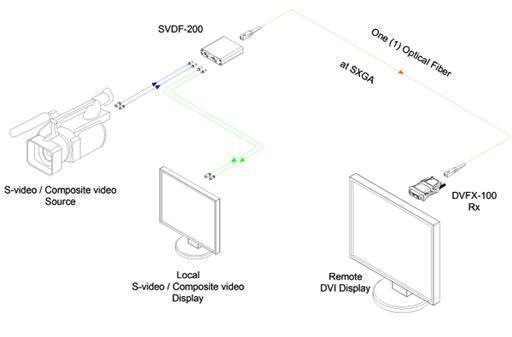SVDF-200 - преобразователь композитного/S-video видеосигнала в сигнал DVI-D со встроенным передатчиком сигнала по оптоволокну. Для передачи используется один многомодовый оптоволоконный кабель стандарта OM2 и выше, длиной до 500 метров, с разъемами SC. Выполняет повышающее масштабирование сигнала до 1280x1024, 60 Гц. Имеет проходные порты для подключения локального дисплея.