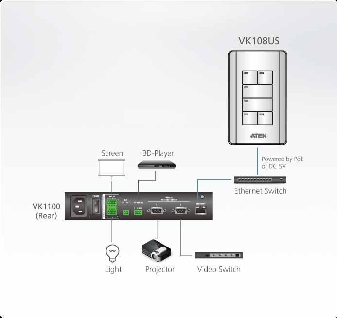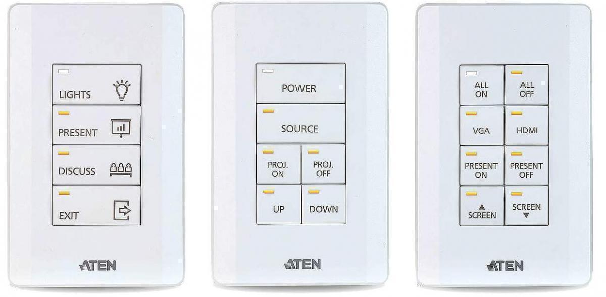 ATEN VK108US, 8-кнопочный блок управляющих клавиш VK108US со стандартной настенной лицевой панелью идеально подходит для использования в качестве основного интерфейса в небольших переговорных или в качестве дополнительного устройства управления в аудиториях и конференц-центрах.Заложенная разработчиками гибкость конфигурирования позволяет пользователю создавать до 14 различных комбинаций, содержащих от 4 до 8 кнопок. При подключении клавиатуры VK108US к блоку управления VK2100/VK1100 по локальной сети, используя программное обеспечение VK6000, можно без труда выполнить настройку предпочитаемого управления любым подключенным устройством.