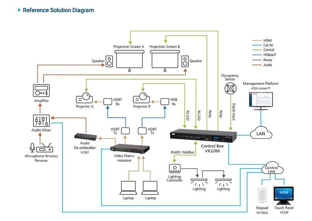 В контроллере второго поколения VK2200 системы управления оборудованием компании ATEN используется производительный четырехъядерный процессор, а также 2 ГБ памяти. Это позволяет ему обеспечить реагирование и обновления статуса в реальном времени, обрабатывать сложные, дающие высокую нагрузку события в графическом интерфейсе с индивидуальным дизайном, а также управлять многопользовательским доступом к подключенным устройствам. Контроллер VK2200 оснащен двумя изолированными портами для подключения LAN - Control LAN (управляемая сеть) и LAN. Для удовлетворения требований повышенной безопасности и стабильности, доступ к управляемым устройствам, находящимся в отдельной, независимой от корпоративной сети, осуществляется через порт Control LAN, позволяя обеспечить надежную защиту. При этом с помощью порта LAN может выполняться подключение к ATEN Unizon, централизованной платформе, оптимизирующей ежедневное управление аудио/видео и ИТ-оборудованием, которая предоставляет пользователям удобство одновременного мониторинга, устранения неполадок и обслуживания нескольких систем.