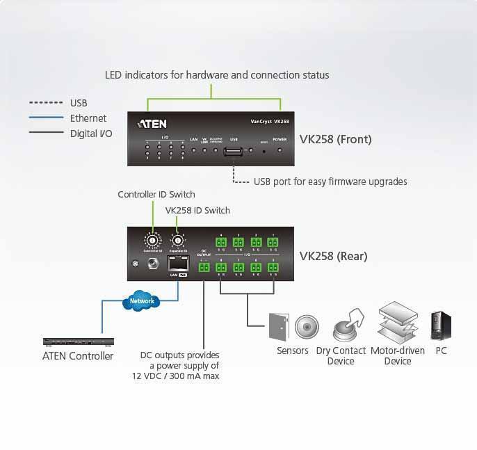 Блок расширения модели ATEN VK258 оснащен восемью дополнительными каналами цифрового ввода-вывода. Это позволяет пользователям в средах, где требуется централизованное управление большим количеством различного оборудования, управлять многочисленными цифровыми устройствами ввода-вывода, такими как: различные датчики, устройства с «сухими контактами», ПК и устройства с электроприводом. Благодаря преимуществу соединения на основе Ethernet, блок расширения легко подключается к контроллеру системы управления ATEN по локальной сети (LAN).