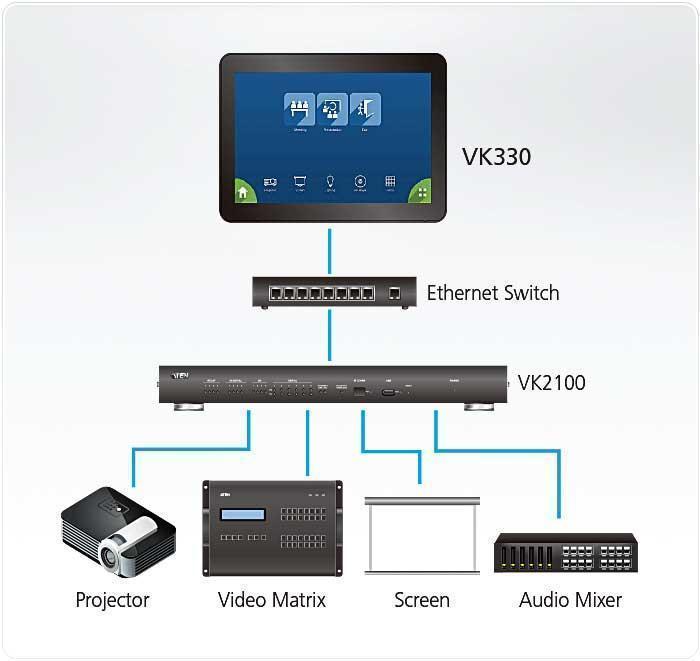 Система управления ATEN - это стандартная система управления на базе Ethernet, состоящая из контроллеров, блоков расширения, конфигуратора и интерфейсов управления, которая соединяет все аппаратные устройства для обеспечения централизованного управления устройствами напрямую и без усилий с любого мобильного устройства или интерфейса системы управления ATEN. Теперь у нас есть сенсорная панель VK330, которая присоединилась к семейству систем управления ATEN, чтобы сделать наше решение системы управления законченным и удовлетворяющим строгим требованиям для целевых приложений.
