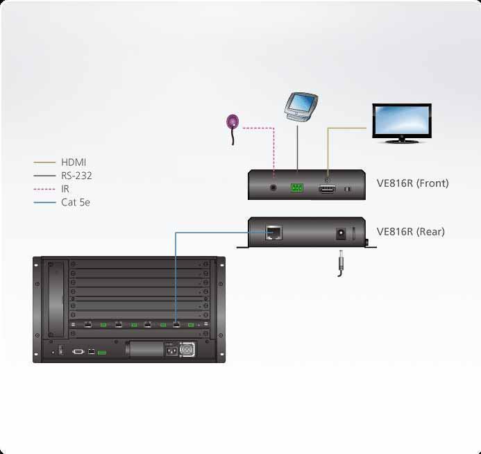Для создания максимального эфекта от обработки аудио/видео приемник-масштабатор 4K HDMI-сигнала VE816R при работе с матричными коммутаторами HDMI HDBaseT-Lite или модульными матричными коммутаторами, оснащенными платами вывода HDBaseT компании ATEN, поддерживает возможность построения видеостен, а также функцию Seamless Switch