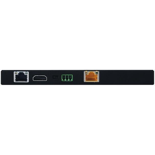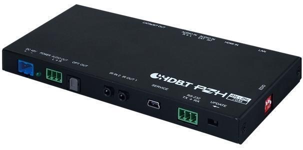 Передатчик сигналов HDMI 4096x2160/60 (4:4:4), 3D c расширенным EDID, HDCP 1.4, 2.2 и CEC, Ethernet 100BaseT, аудио (Phoenix 3-pin), ИК (2х miniJack 3,5 мм) и RS-232 (Phoenix 3-pin) в витую пару CAT5e c PoH 48 В, Optical Audio Return (OAR) со стереоаудио (Phoenix 3-pin), расстояние передачи до 100 м. Полоса пропускания 600 МГц,