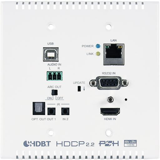 Настенная панель-передатчик сигналов HDMI 4Kх2K/60 (YUV 4:2:0), 3D с HDCP 2.2 и ARC, Ethernet (RJ45), ИК (2хmJack) и RS-232 (Dsub-9), небал. стерео (Phoenix), USB 2.0 (тип B) в витую пару CAT5e с PoH (Power over HDBaseT) 48 В от приемника, HDBaseT 2.0, прием цифрового аудио S/PDIF (Toslink) до 48 кГц, расстояние до 100 м. Без блока питания. Совместимый приемник CH-2602RX. Размер 2G для США.