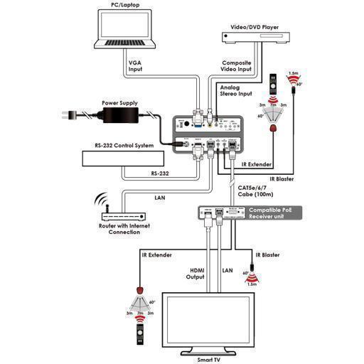 Передатчик сигналов - масштабатор CV(RCA), VGA(Dsub-15) 1080p/60 (1920x1200), стерео аудио (mJack), ИК(2хmJack), RS-232(Dsub-9), Ethernet(RJ-45) в витую пару CAT5e с двунаправленным PoE, HDBaseT, расстояние до 100м