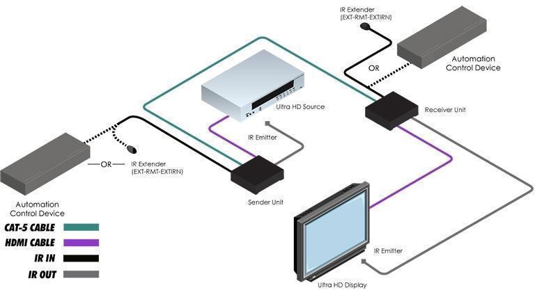Комплект устройств для передачи HDMI 2.0 (4096x2160/30 при YUV 4:4:4, 3840x2160/60 при YUV 4:2:0, 3D) с HDCP 2.2/1.4, расширенным EDID и CEC, двунаправленного ИК (2х miniJack 3,5 мм) по витой паре CAT5e с двунаправленным POL, HDBaseT, расстояние передачи 4K до 40 м, 1080p – до 70 м.