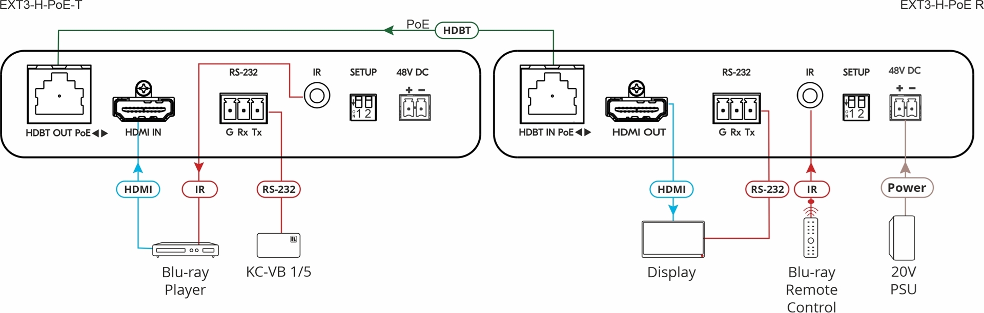 EXT3-H-PОE-T — передатчик сигналов 4K60 (4:4:4) HDR HDMI, RS−232 и ИК по кабелю витой пары HDBaseT 3.0. Прибор преобразует поступающие на его вход видеосигнал, а также сигналы управления в сигнал HDBaseT 3.0, который далее передается по кабелю витой пары на совместимый приемник. Максимальное расстояние передачи составляет 40 м для видеосигналов разрешением до 4K60 (4:4:4), Full HD до 70м. Устройство может быть как потребителем, так и источником питания PoE для совместимых приемников.