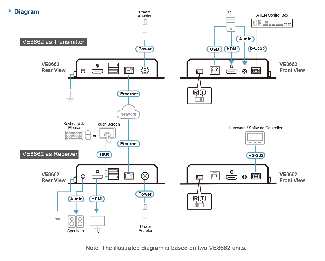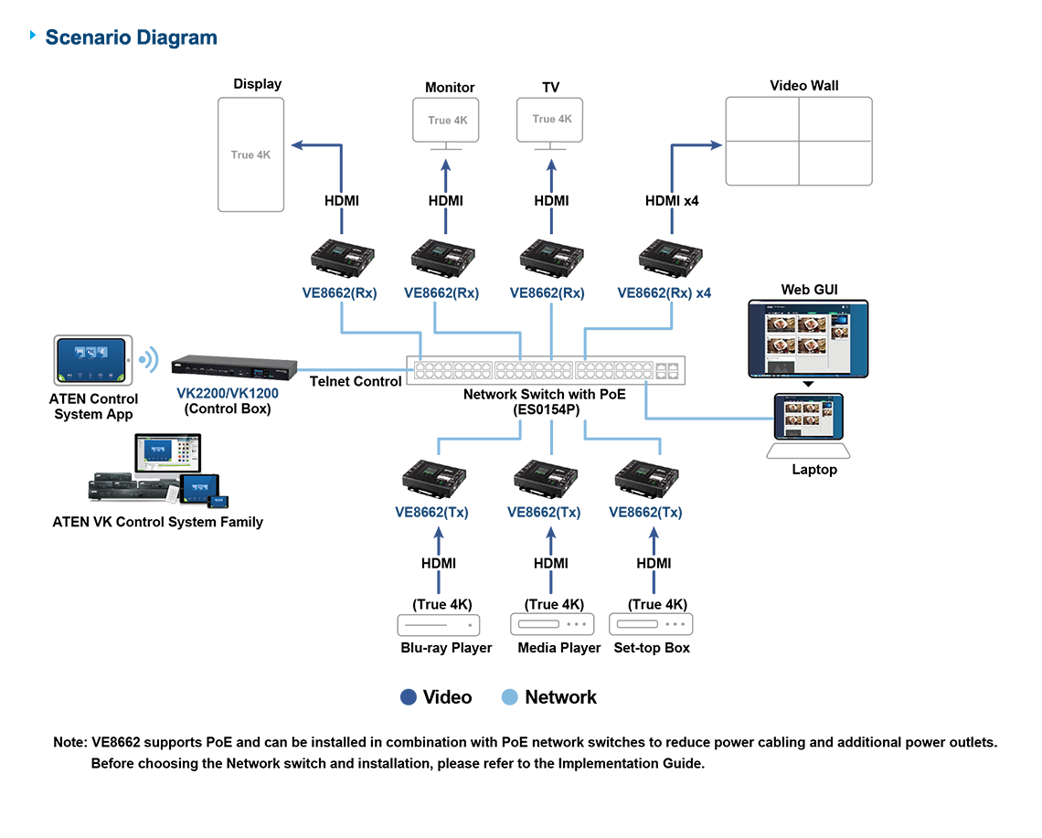 - Интегрированное решение — совместимо с системой управления ATEN , что позволяет пользователям напрямую управлять VE8662 через CLI Telnet или протокол RS-232