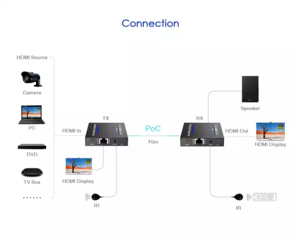 - Передает сигнал HDMI до 70 метров при использовании витой пары категории CAT6