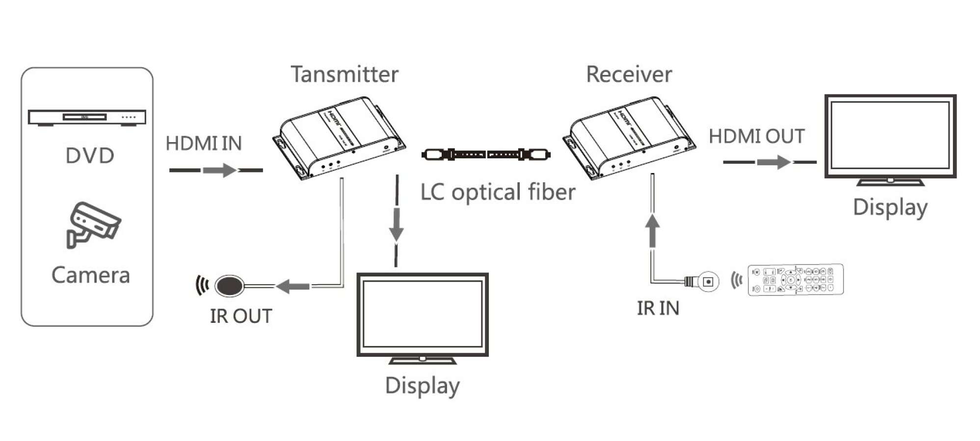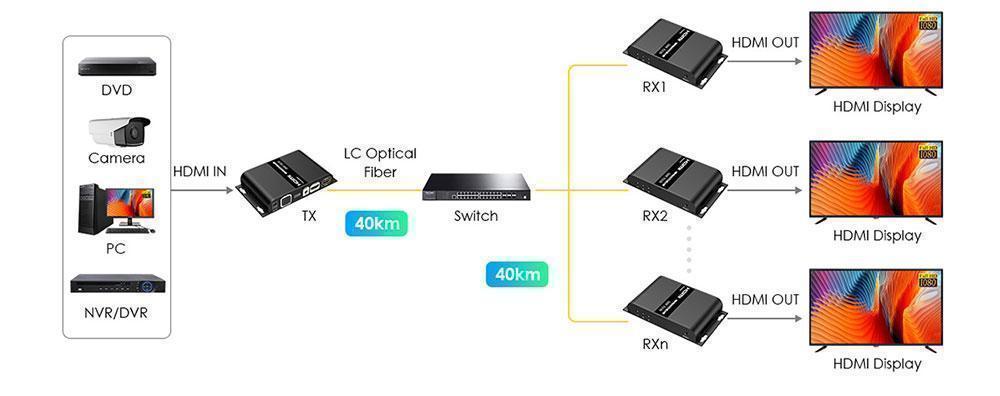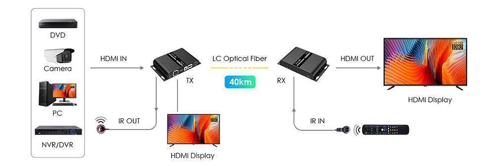 В этом волоконно-оптическом удлинителе используется одномодовое оптоволокно (SMF) для передачи сигналов высокой четкости на расстояние до 40 км, а также поддерживается локальный выход и обратная передача ИК-сигнала. Его можно широко использовать в мониторинге безопасности, медицинских системах, коммерческих дисплеях и др