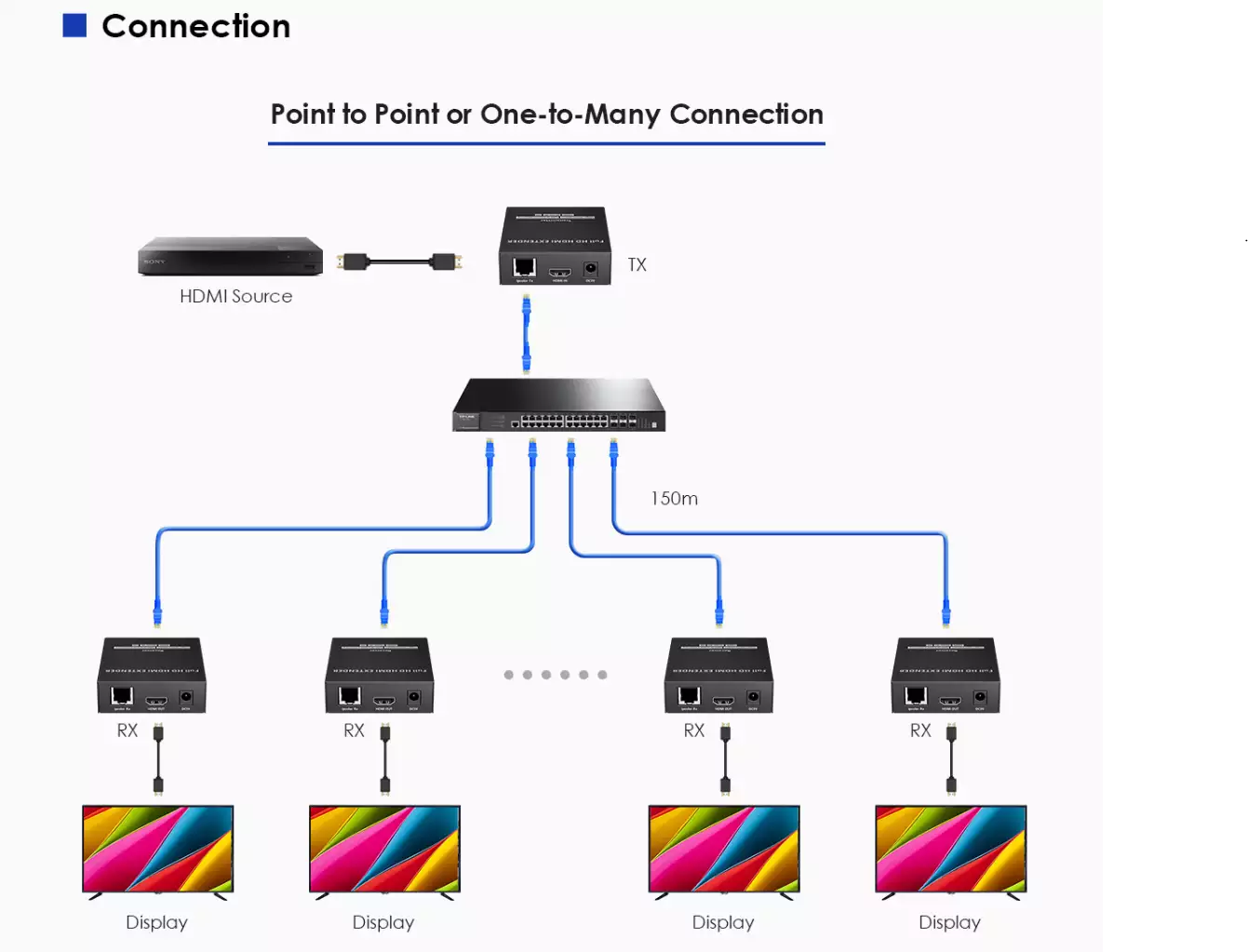 - Передает сигнал HDMI до 150 метров при использовании витой пары категории CAT6