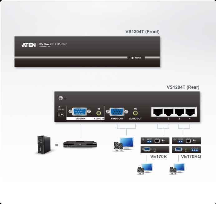 VS1204T-AT-G – Видео Разветвитель ATEN VS1204T предназначен для подключения на большом расстоянии четырех устройств отображения VGA и Аудио к одному источнику сигнала. Для передачи сигналов используется кабель UTP Cat.5.Для вывода аудио/видео сигналов от разветвителя VS1204T применяются совместимые с устройством приемники*.