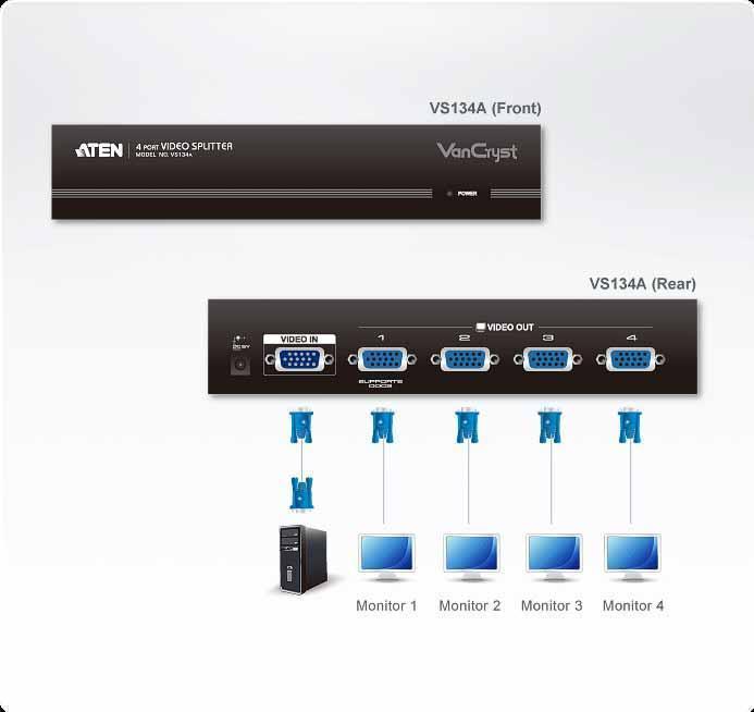 Разветвитель VS134A – лучший выбор для передачи нескольких сигналов VGA, XGA, SVGA, UXGA, QXGA или Multisync высокого качества на большие расстояния.