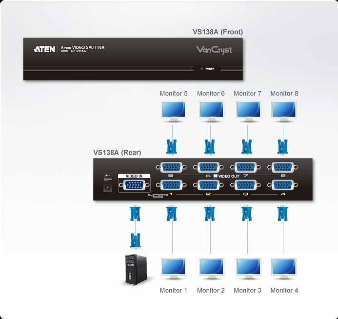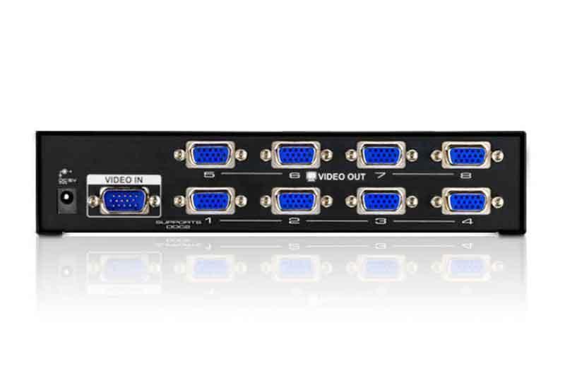 Разветвитель VS138A – лучший выбор для передачи нескольких сигналов VGA, XGA, SVGA, UXGA, QXGA или Multisync высокого качества на большие расстояния.
