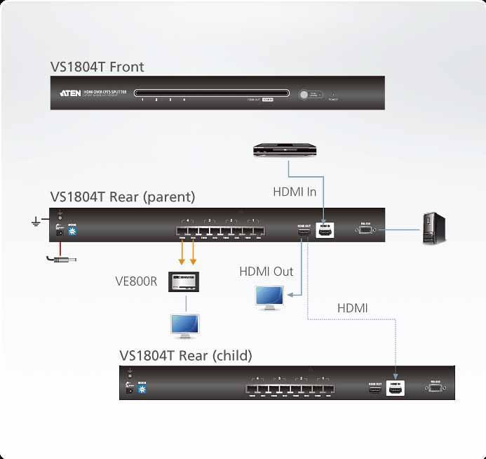VS1804T-AT-G – Видео Разветвитель ATEN VS1804T обеспечивает наиболее простой и эффективный способ передачи мультимедиа в формате HDMI и данных HDCP от 1 источника к 4 дисплеям.VS1804T — это многоточечная система «от одного к нескольким» для передачи аудио и видео высокой четкости; передает в режиме реального времени мультимедиа контент от исходных устройств HDMI на дисплеи HDMI по кабелям Cat 5e.