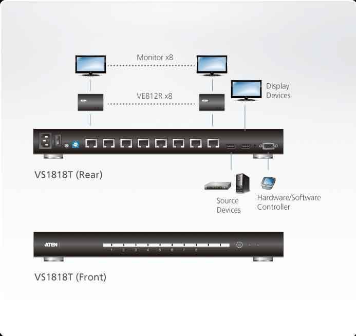VS1818T-AT-G – Видео Разветвитель ATEN VS1818T позволяет быстро и эффективно передавать видеопотоки высокого качества от 1 источника сигнала к 8 дисплеям, удаленным от него на расстояние до 100 метров.В Разветвителе VS1818T реализована технология HDBaseT, позволяющая подключать к VS1818T устройства-приемники с помощью одного кабеля UTP Cat.5e и выполнять передачу объемного HDMI-мультимедийного контента в реальном времени. Поддерживаются разрешения изображения до 4k. Предоставляется возможность выбора метода установки EDID с целью обеспечения постоянной и надежной передачи данных EDID-данных к устройству-источнику HDMI-сигнала, позволяющая эффективно оптимизировать видеоразрешение.