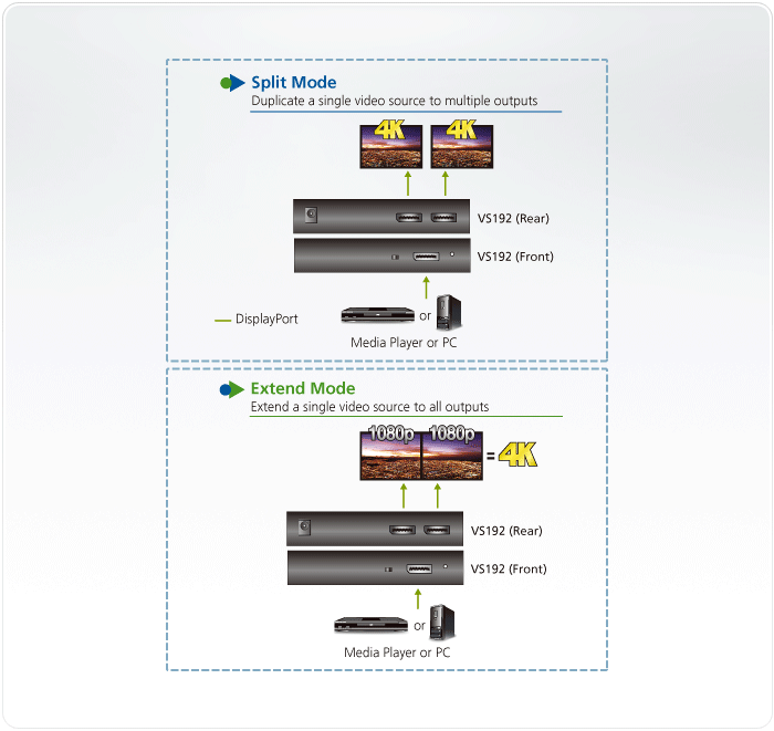 Видеоразветвитель VS192 совместим с DisplayPort 1.2a и поддерживает разрешение изображения до 4K при 60 Гц, что делает его эффективным и идеальным при использовании с любыми дисплеями, оснащенными интерфейсом DisplayPort в применении не только для домашнего кинотеатра, но также в корпоративных, образовательных и коммерческих средах.