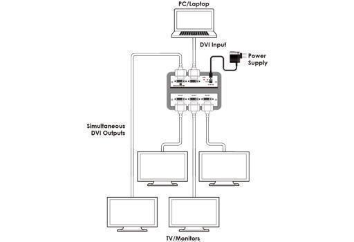 1:4 Усилитель-распределитель CDVI-4S сигналов DVI-D Single Link принимает сигнал и затем распределяет его на четыре идентичных буферизированных выхода, каждый из которых может быть подключен к дисплею кабелем DVI длиной до 15 м. Усилитель может работать с сигналами HDMI, для этого необходим соответствующий адаптер или переходный кабель. Отвечает требованиям HDCP, совместим с HDTV. Выполнен в металлическом корпусе черного цвета.
