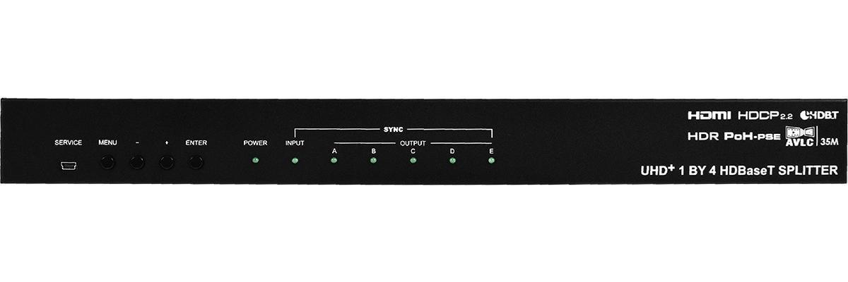 Усилитель-распределитель 1:4 (HDMI + 4xHDBaseT Cat5e с PoH) сигналов HDMI 4096x2160/60 (4:4:4) с HDCP 1.4, 2.2, CEC, HDR и AVLC, двунаправленных сигналов управления ИК и RS-232, деэмбеддер аудио. EDID на каждом выходе. Дальность – 40 м (4K). Полоса пропускания 600 МГц. Управление по RS-232.
