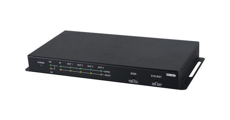 Усилитель-распределитель 1:4 сигналов HDMI 3D, 4096x2160/60 (4:4:4) с HDCP 1.4, 2.2, HDR, CEC и EDID, расстояние передачи сигнала 4K – до 5 м. Полоса пропускания 600 МГц. Поддержка эмбеддированного аудио до 192 кГц.