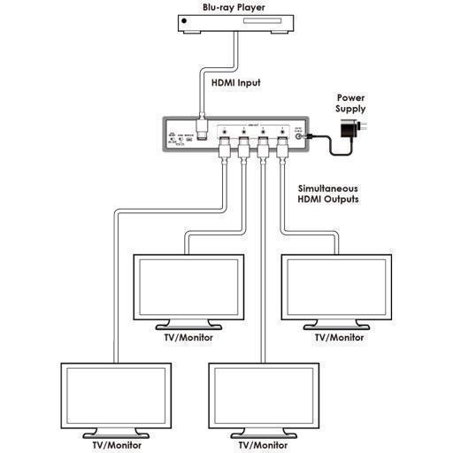 Усилитель-распределитель 1:4 сигналов HDMI 1080p/60 (3840x2160p/30, 4096x2160p/24, 3D) с EDID, расстояние до 15м(5+10) при 4K2K