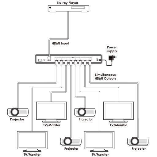- Отображение сигнала HDMI от одного источника одновременно на 8-ми ТВ/проекторах