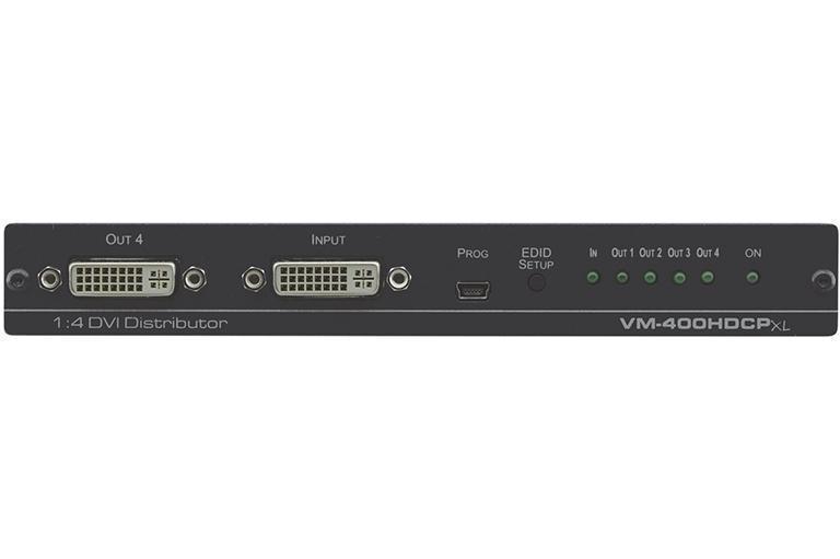 VM-400HDCPXL – высококачественный усилитель-распределитель 1:4 сигнала интерфейса DVI разрешением до UHD 4K/60 (при YUV 4:2:0) с поддержкой HDCP и интеллектуальной обработкой EDID. Прибор выполняет перетактирование сигнала и компенсацию АЧХ кабеля, после чего выдает сигнал на 4 одинаковых выхода.