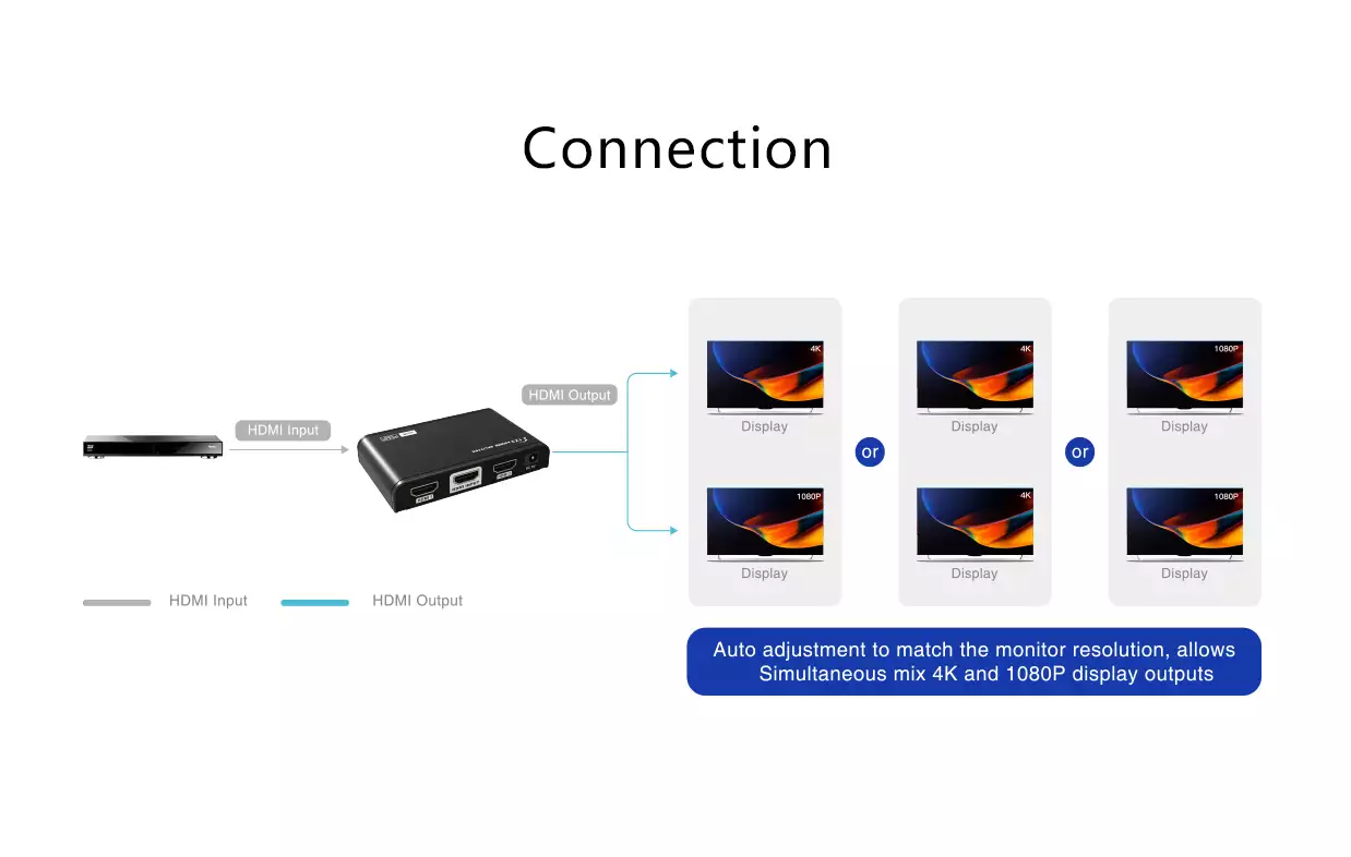 - Распределяет 1 вход HDMI на 2 выхода HDMI