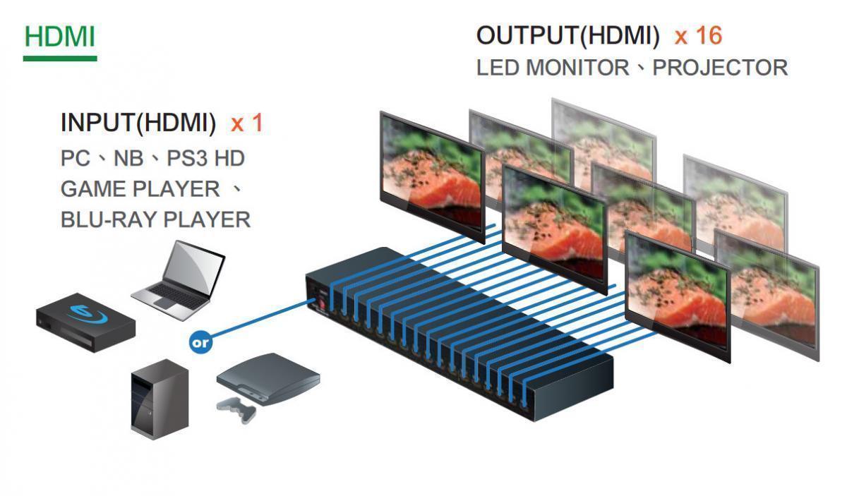 Разветвитель HDMI TNT MMS-3816VSH предназначен для разветвления (дублирования) исходного HDMI сигнала в шестнадцать выходов.В качестве источников сигнала можно использовать различное оборудование, имеющее HDMI интерфейс, например, DVD-плееры, контент-плееры, спутниковые телевизионные приставки и т.д. В качестве устройств отображения, также возможно использование любых устройств с интерфейсом HDMI, таких как мониторы, проекторы, телевизоры и т.д..