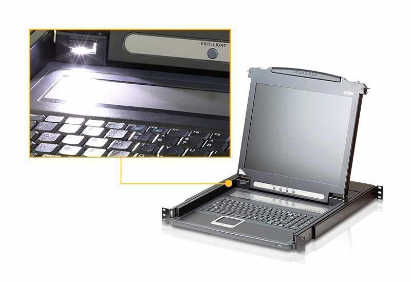 - Эксклюзивная светодиодная подсветка – разработана компанией ATEN для подсвечивания клавиатуры и сенсорной панели, чтобы улучшить видимость в условиях низкой освещенности