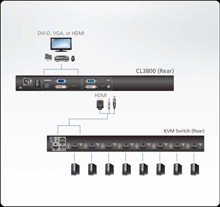 CL3800 оснащена портом для внешней USB-мыши на передней панели устройства, а порты для второй консоли KVM (USB-клавиатура / мышь, HDMI, DVI или VGA-монитор) предусмотрены на задней панели. CL3800 также включает в себя два мини-стереофонических порта для подключения аудио динамики.
